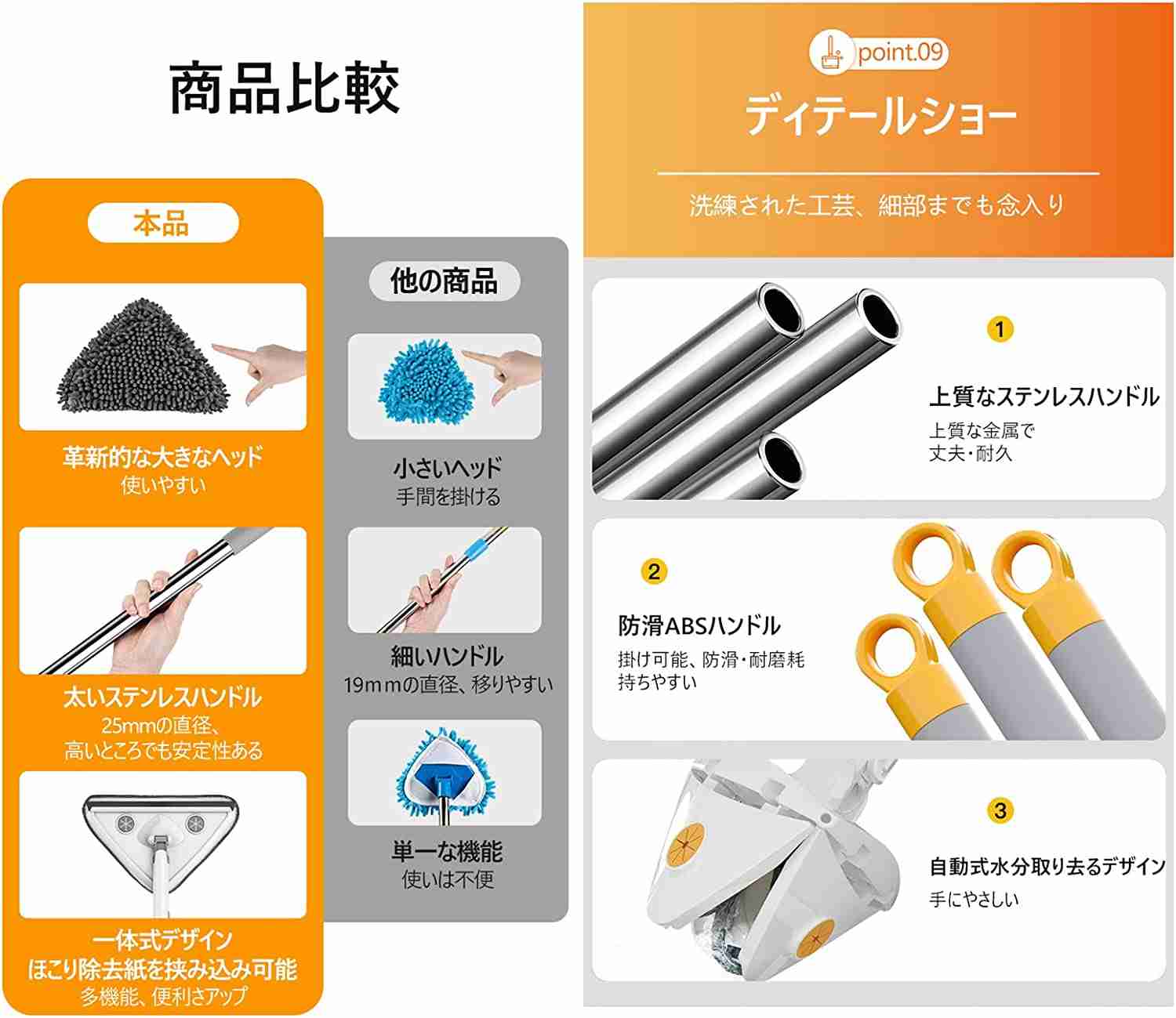 モップのヘッドは簡単に取り外せて、水洗い可能です。何度でも繰り返し使えて経済的です。